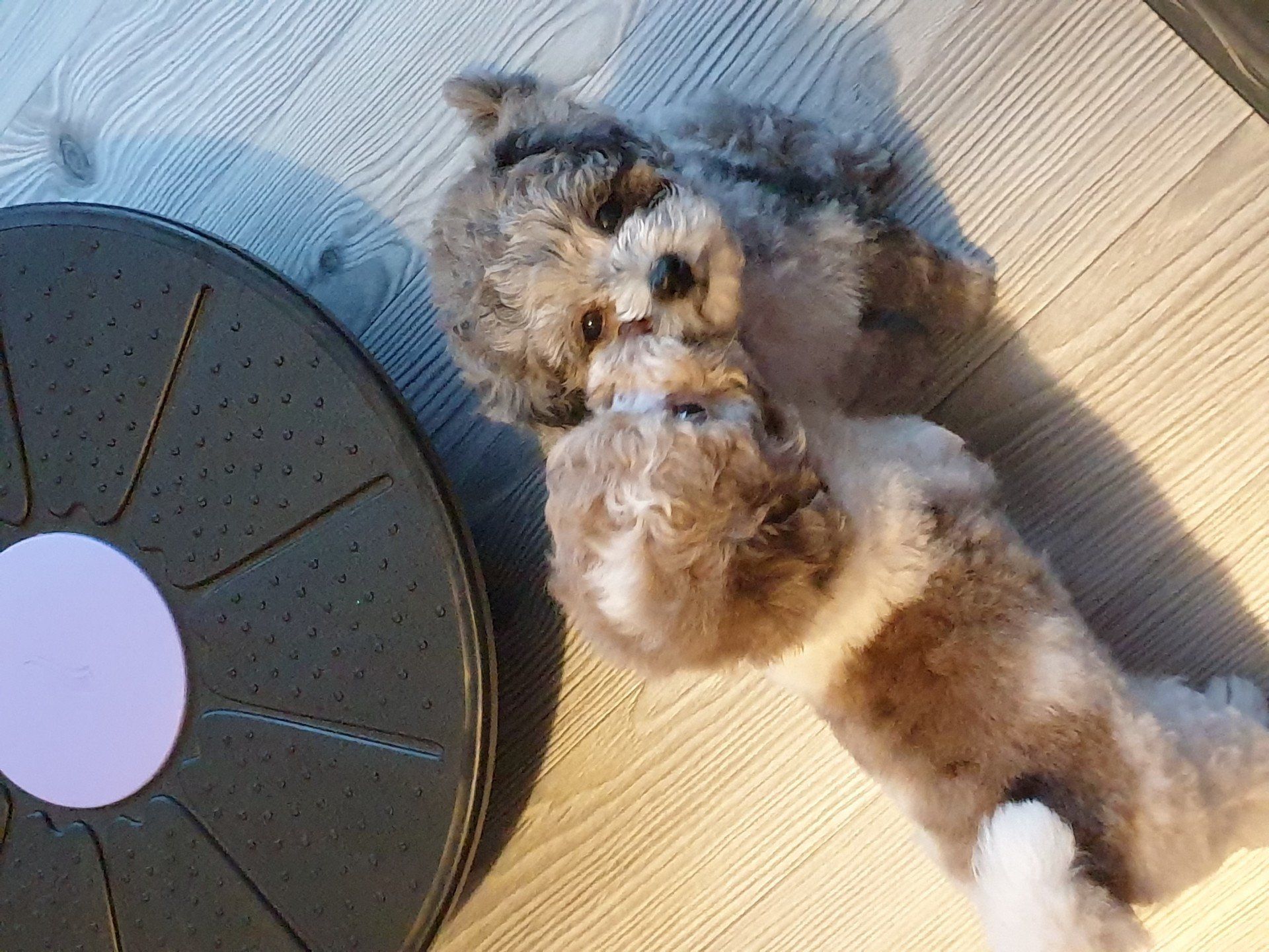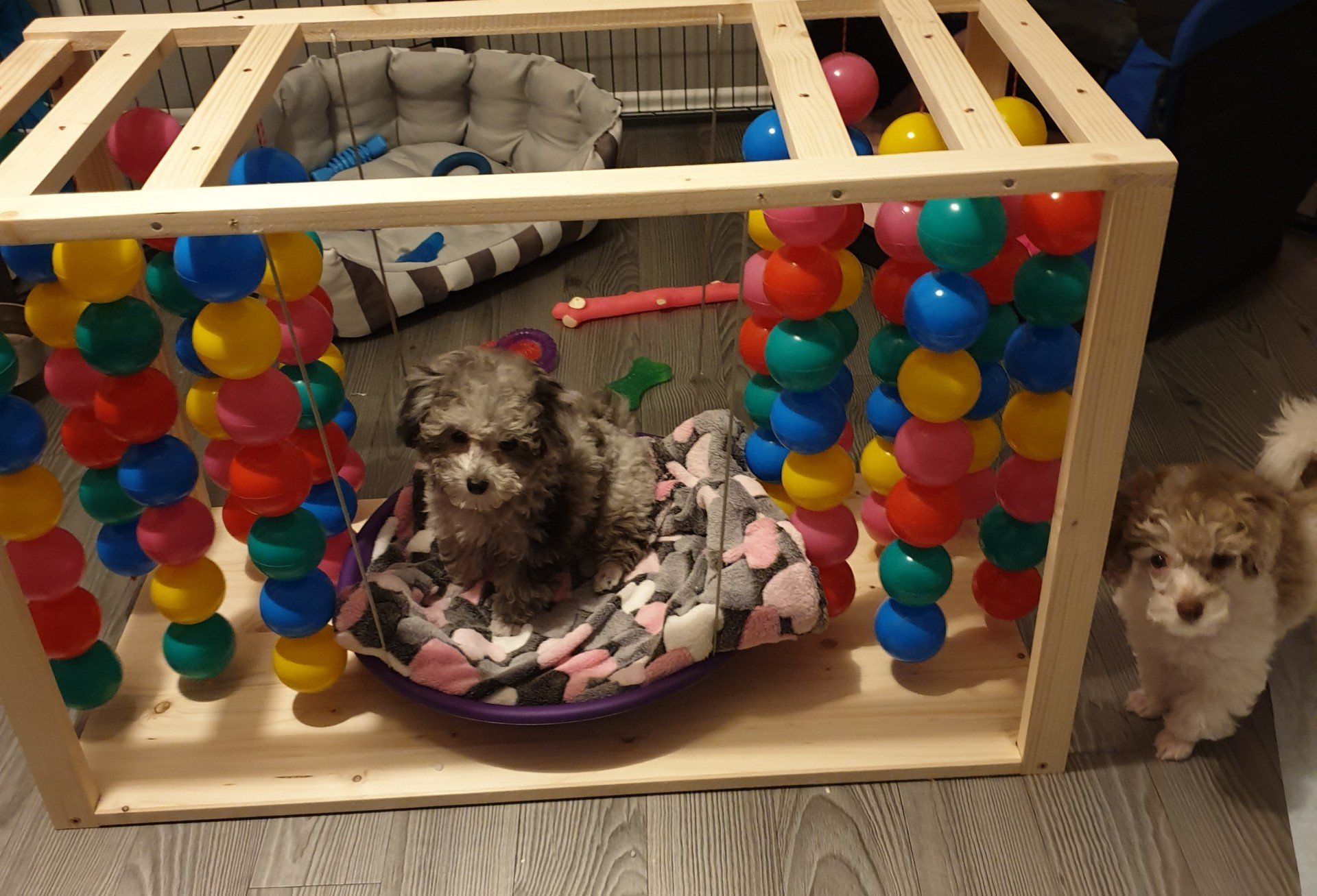 Prägungsspielzeug ist natürlich auch vorhanden, verschiedene Untergründe sind auch wichtig ebenso der Kontakt zu anderen Hunden.